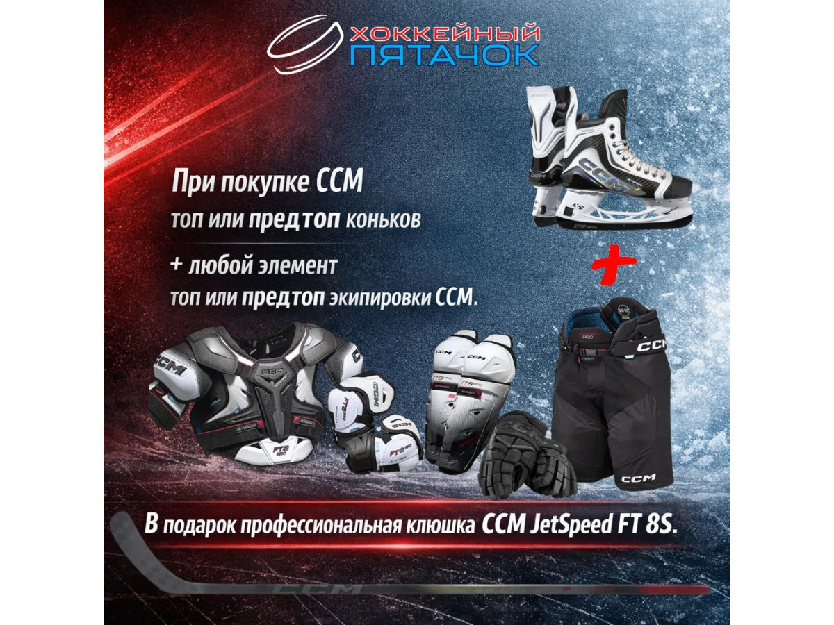 Покупайте топовые или предтоповые коньки CCM и любой элемент защиты CCM того же уровня (нагрудник, налокотники, перчатки, щитки, трусы) — и мы дарим вам профессиональную клюшку JetSpeed FT 8S!